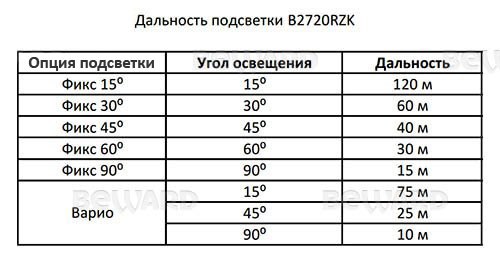 Камера B2720RZK может поставляться с варифокальной или фиксированной ИК-подсветкой. Угол освещенияварифокальной ИК-подсветки изменяется дискретно, подстройку можно производить через веб-интерфейс IP-камеры. Таким образом варифокальная ИК-подсветка позволяет Вам в режиме реального времени подбирать угол подсветки в соответствии с полем зрения камеры. Поэтому изображение будет равномерно освещено и хорошо различимо. Угол освещения фиксированной подсветки можно выбрать на этапе покупки камеры в зависимости от условий (см. таблицу «Дальность подсветки B2720RZK»). ИК-светодиоды III поколения, которыми оснащена сетевая камера B720RZK, отличаются увеличенным ресурсом работы и высокой стабильностью параметров в сравнении с обычными. Дальность подсветки достигает 120 м.