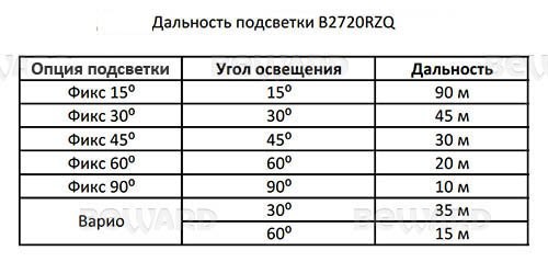 При покупке B2720RZQ реализована возможность выбора фиксированной или варифокальной ИК-подсветки. Угол освещения варифокальной ИК-подсветки изменяется дискретно через веб-интерфейс IP-камеры. Угол освещения фиксированной подсветки можно выбрать на этапе покупки камеры в зависимости от условий и задач видеонаблюдения (см. таблицу «Дальность подсветки и углы обзора»). ИК-светодиоды 3-го поколения, которыми оснащена сетевая камера B720RZQ, отличаются увеличенным ресурсом работы и высокой стабильностью параметров в сравнении с обычными. Освещение распределяется равномерно, поэтому и изображение хорошо различимо целиком. Дальность подсветки достигает 90 м.